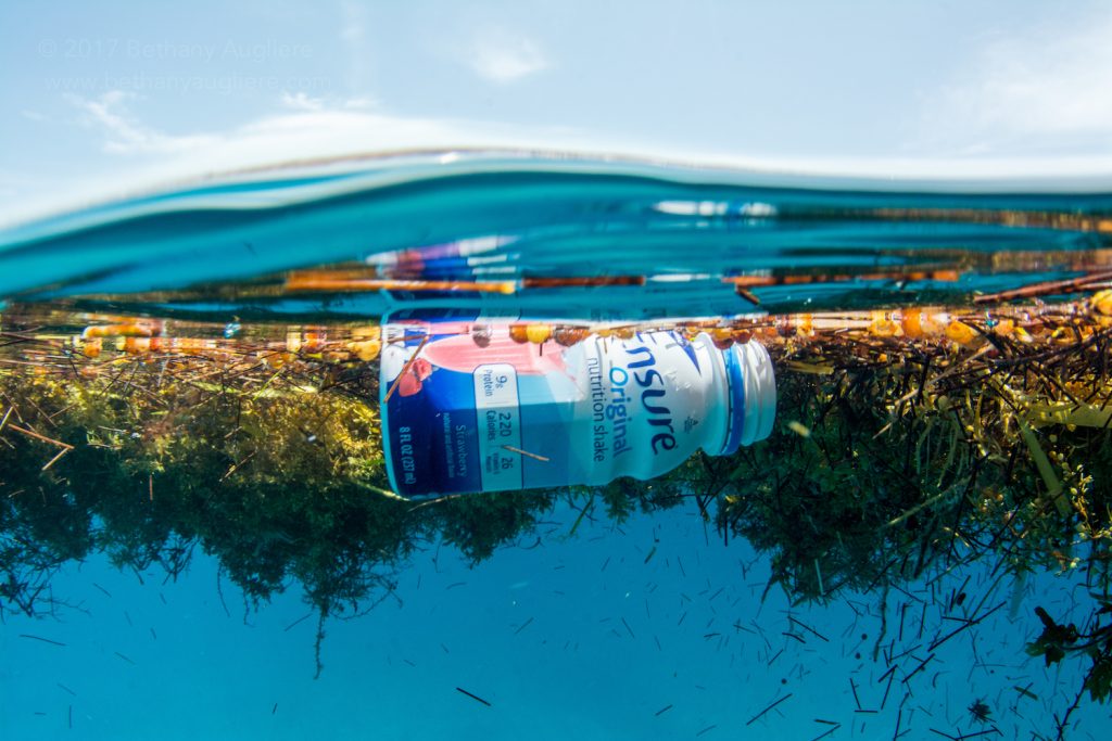 Plastic floating in a seaweed patch in the Bahamas, in dolphin habitat. Photo by Bethany Augliere/Wild Dolphin Project.